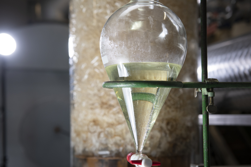 Erst jetzt beginnt die eigentliche Produktion der Allgäuer Latschenkiefer – wenn das Material den Häcksler durchlaufen hat wird es über ein Förderband und Schnecken in Drucktanks gefüllt, welche nach der Befüllung dann verschlossen und mit Wasserdampf unter Druck gesetzt werden. Nach dem Erreichen des Drucks und der Temperatur beginnt der eigentliche Destillationsprozess. Das durch den Wasserdampf erzeugte Destillat wird in einem Glasbehälter gesammelt. Hier trennt sich das Latschenkiefernöl vom Wasser setzt sich oben ab und wird abgefüllt. Dabei hat es bei uns oberste Priorität, dass die volle Wirkung des Öls erhalten bleibt.